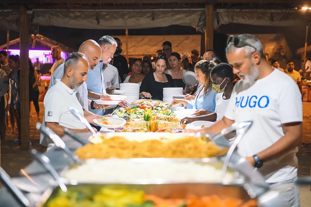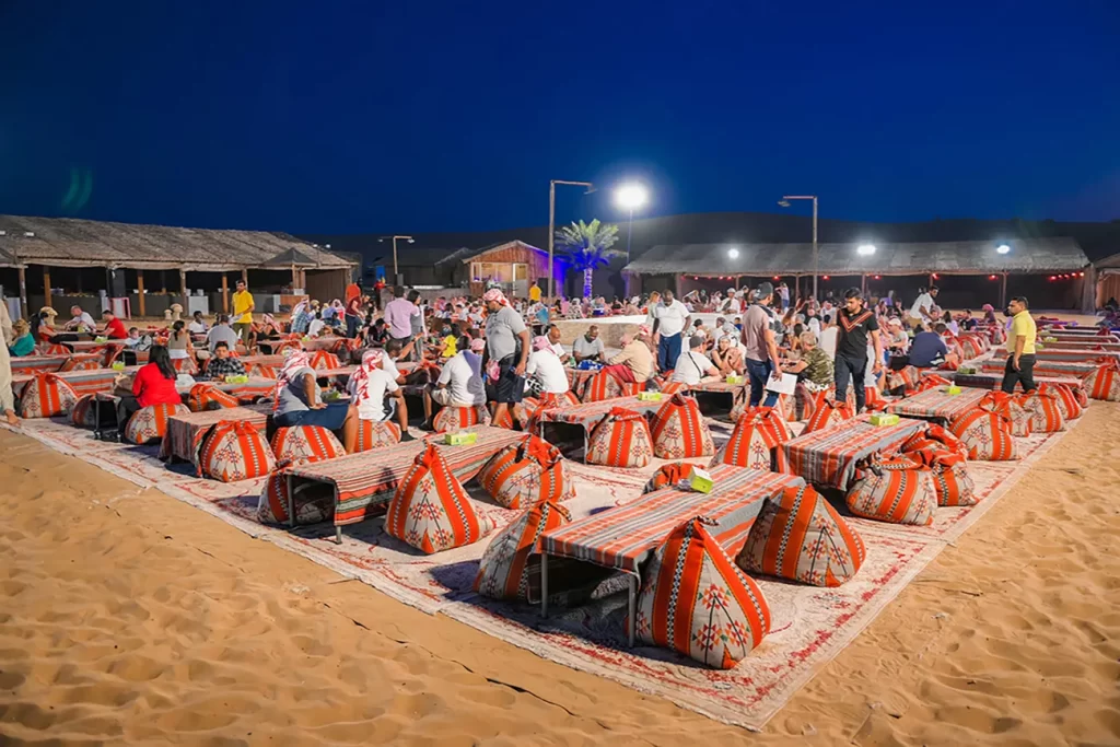 Indulge in a delicious BBQ dinner under the stars, featuring authentic Emirati and Arabic dishes (vegetarian options available).